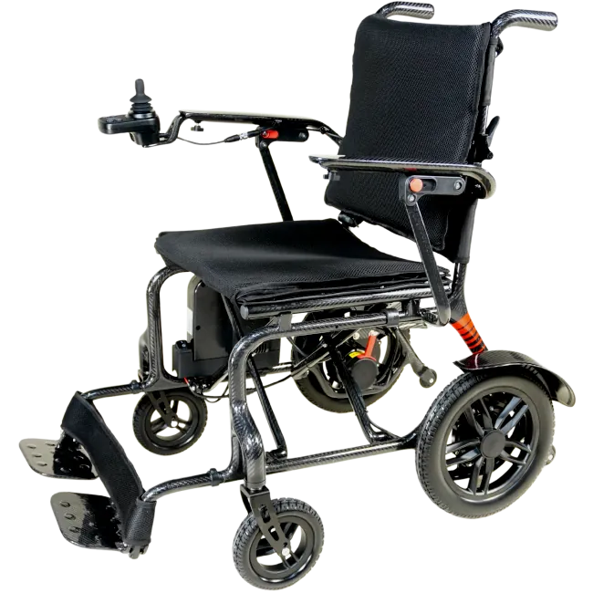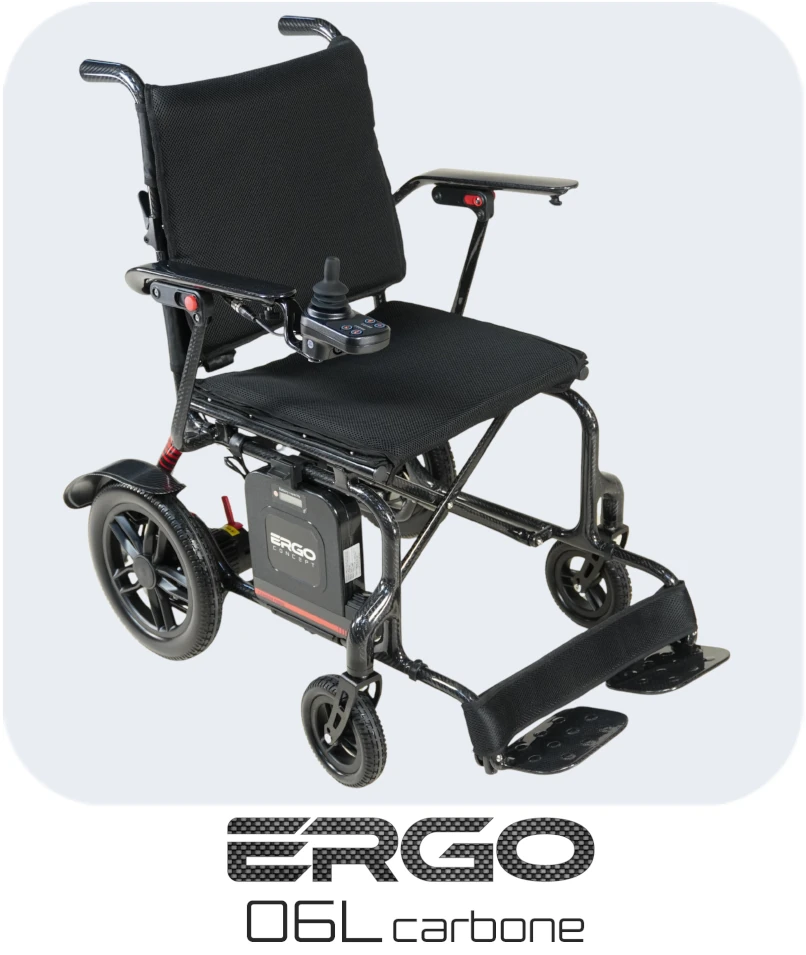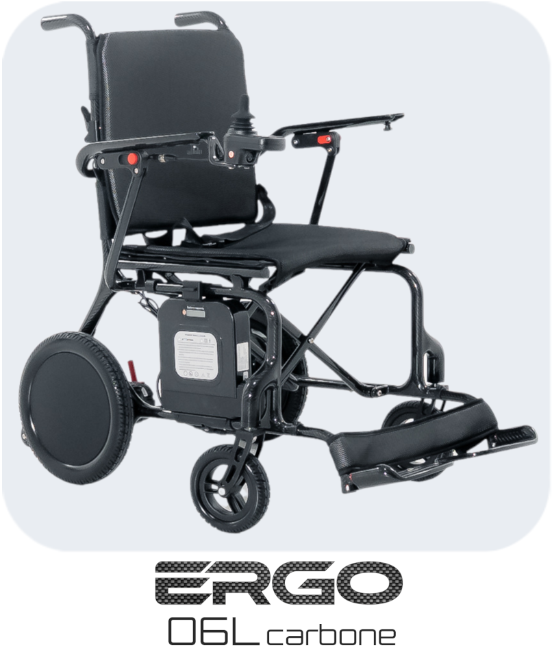 La Ergo 06L Carbon unisce la leggerezza di un telaio in fibra di carbonio alla praticità di una rapida chiusura. Dal soggiorno al bagagliaio della city car, questa sedia a rotelle elettrica pieghevole e ultraleggera ti accompagna ovunque… senza appesantirti.